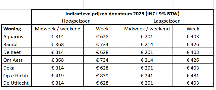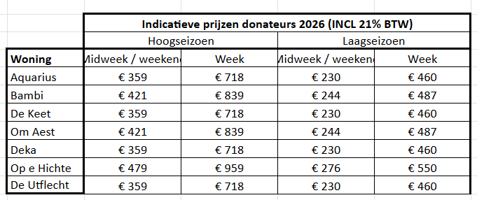 Onze donateurs hebben korting op de huurprijzen, maar externen kunnen onze mooie woningen gewoon huren. De prijzen kun je vinden als je ingelogd bent en hieronder.